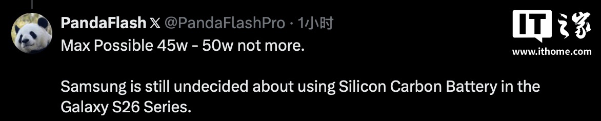 在回复网友提问时该爆料人进一步指出,S26 Ultra 的最大充电功率将在 45W 到 50W 之间,并称三星目前尚未决定是否在 S26 系列中采用硅碳电池。