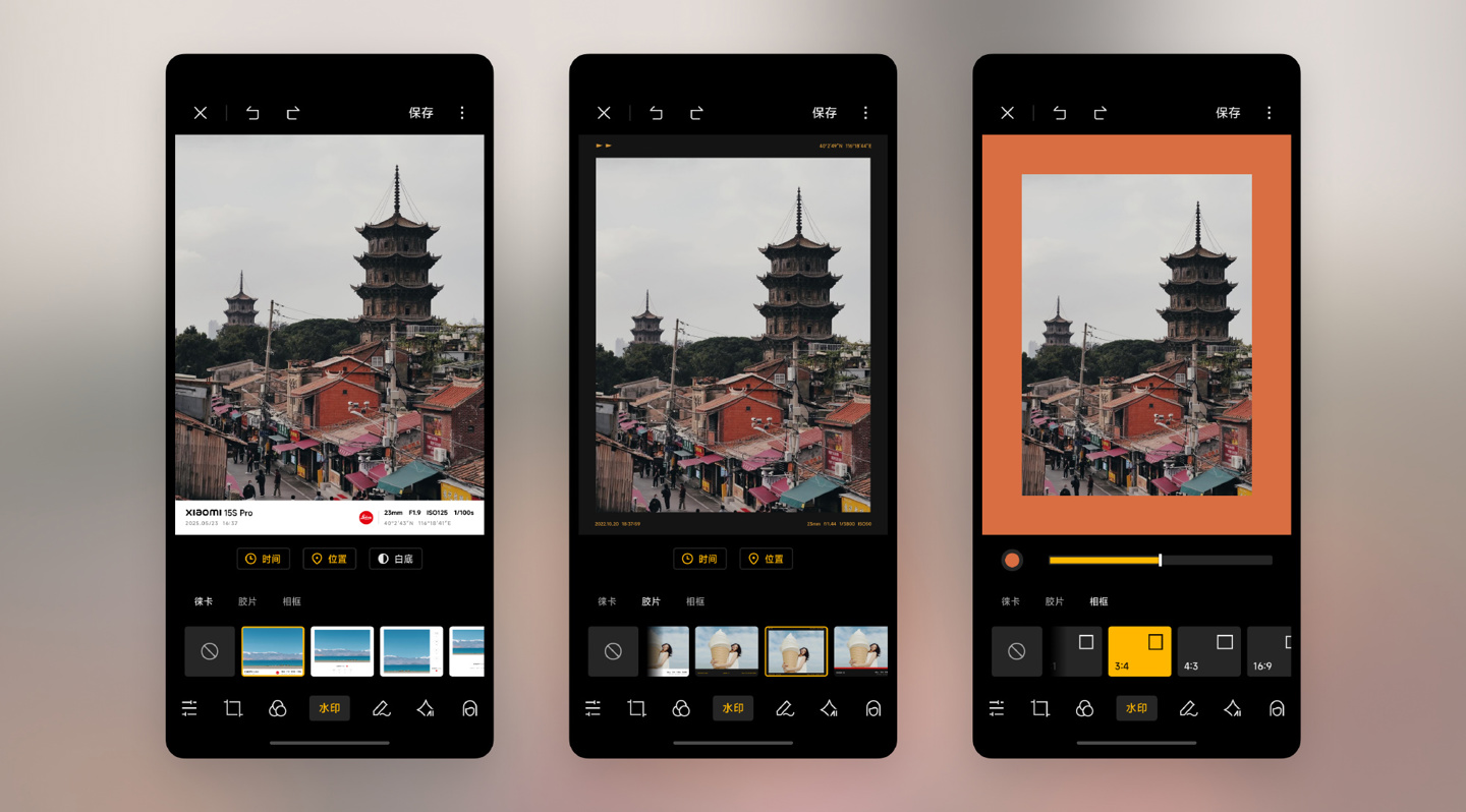 重新思考了水印画框和相框的功能定位,对其进行了功能上的合并,同时也把原来 REDMI 系列胶片水印带到了小米机型上,用户能有更多水印画框选择。