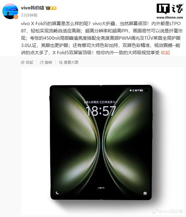 IT之家 6 月 9 日消息,vivo 产品经理韩伯啸今日在微博晒出 vivo X Fold5 折叠屏手机正面照,并介绍了屏幕部分亮点。