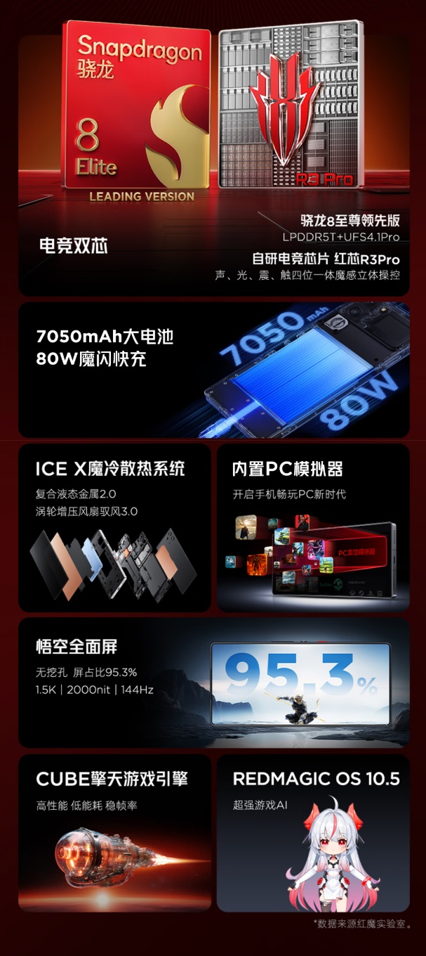配置方面,红魔 10S Pro 手机搭载骁龙 8 至尊领先版处理器、自研电竞芯片红芯 R3Pro、7050mAh 大电池 + 80W 快充、1.5K 悟空全面屏、ICE X 魔冷散热系统,内置 PC 模拟器,独家适配《鸣潮》90Hz。