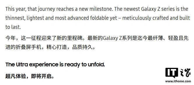 文章来源于互联网:IT之家-三星预热 Galaxy Z Fold7:“最薄、最轻、最先进”的折叠屏手机