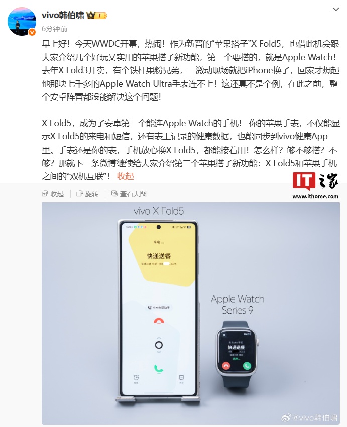 IT之家 6 月 10 日消息,vivo 通信科技有限公司产品经理韩伯啸今日发文宣布,vivo X Fold5 折叠屏新机将成为安卓第一个能连 Apple Watch 的手机。