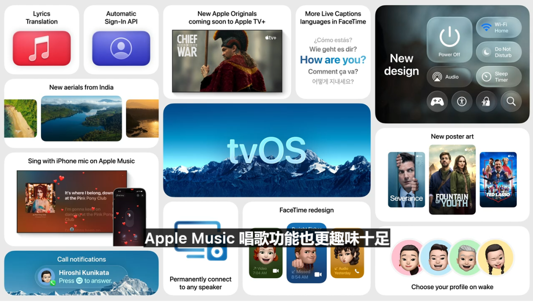 引入新设计的 Apple TV App,画面以折射效果呈现,在不影响看剧的情况下,融入操作选项,控制中心和应用界面重新设计。