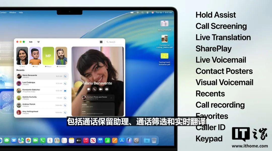 通话体验亦获得增强,Mac 新增电话 App,可从 iPhone 同步最近通话通讯录和语音留言等,还能一键打电话。