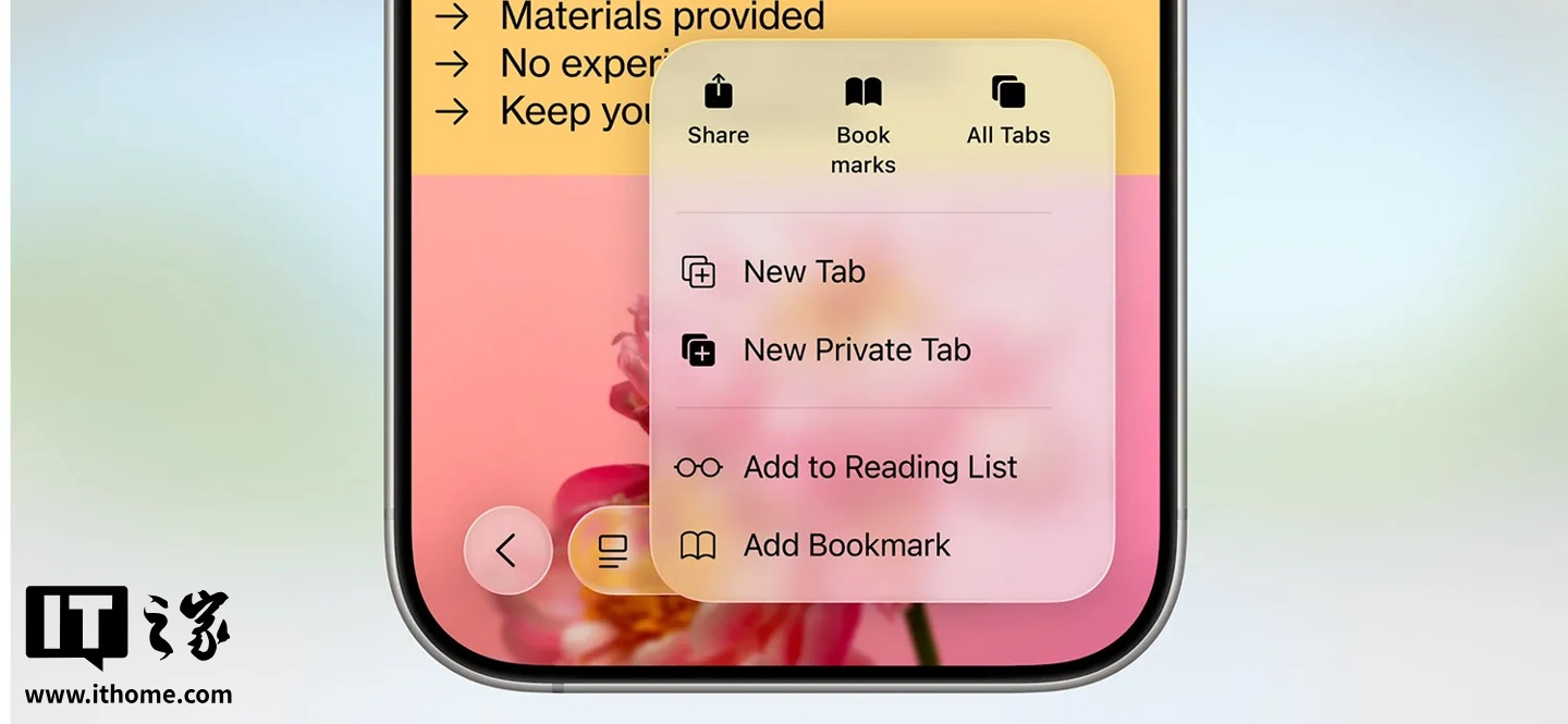 文章来源于互联网:IT之家-苹果 iOS 26 Safari 迎来新界面:无边框网页与液态玻璃动画带来沉浸式浏览体验