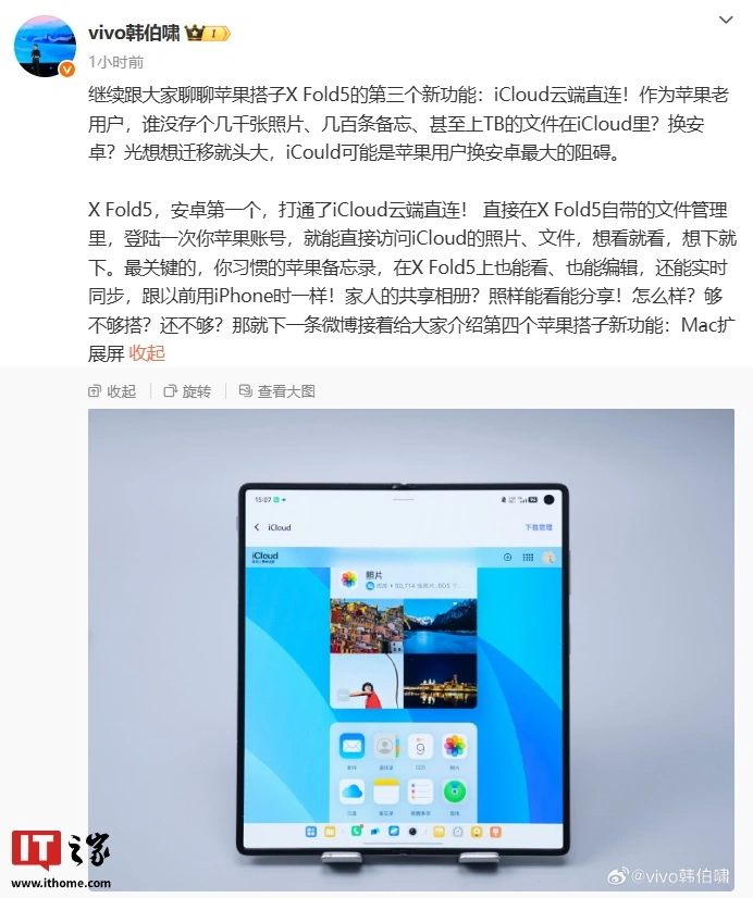 IT之家 6 月 10 日消息,vivo 通信科技有限公司产品经理韩伯啸今日发文宣布,vivo X Fold5 折叠屏新机将成为安卓第一个打通了 iCloud 云端直连的机型。