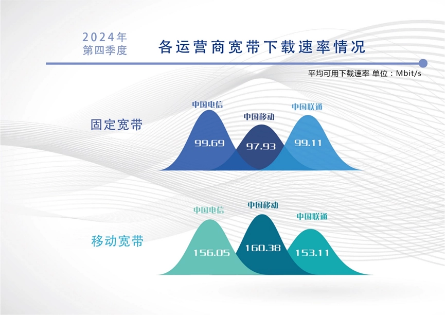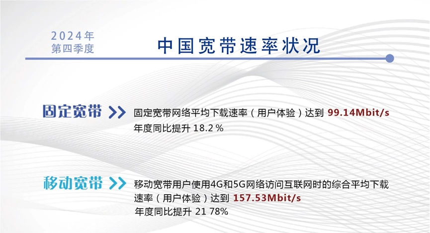报告显示,2024 年第四季度,我国固定宽带网络平均下载速率(用户体验)达到 99.14Mbit/s,环比上季度提升了 3.51%,同比提升了 15.26Mbit/s,年度提升幅度达到 18.2%。