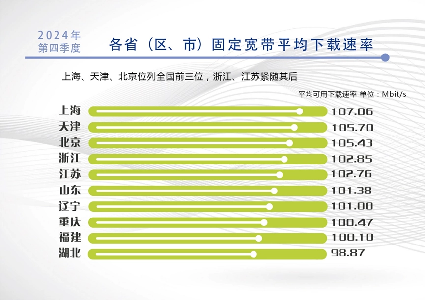 固定宽带下载速率方面,上海、天津、北京位列全国前三位,浙江、江苏紧随其后。各基础电信企业中,中国电信最高,全国用户平均固定宽带下载速率达到 99.69Mbit/s。