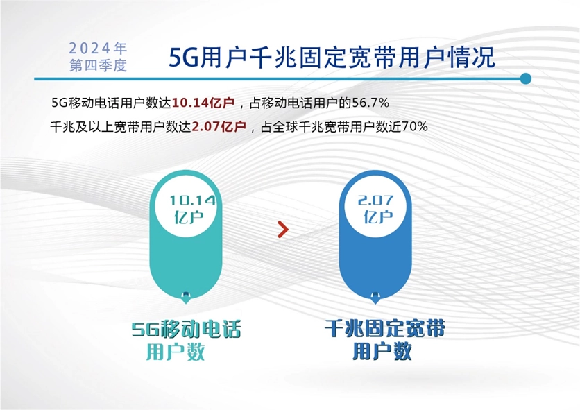 “十四五”以来,我国建成了全球规模最大,技术领先的固定和移动宽带网络。截至 2024 年末,光纤接入(FTTH / O)端口达到 96.5%,千兆光网全面覆盖城市家庭,并实现“县县通千兆”,具备千兆接入能力的 10G PON 端口数达到 2820 万个,占全球千兆接入端口数近 80%,千兆及以上宽带用户数达到 2.07 亿户,占总用户数的 30.9%,占全球千兆宽带用户数近 70%。
