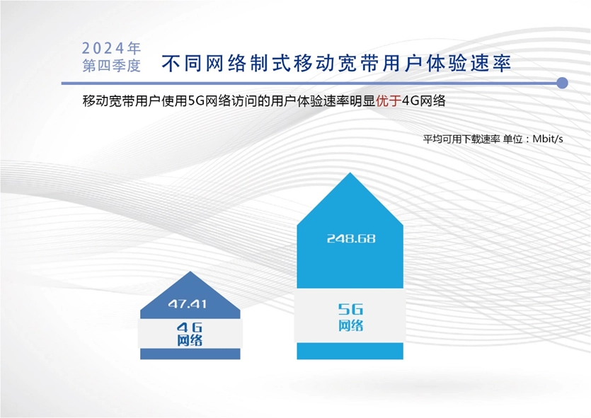 此外,报告同期还发布了 2024 年第四季度我国不同网络制式的移动宽带用户体验速率情况,其中用户使用 4G 网络访问互联网时的综合平均下载速率为 47.41Mbit/s,使用 5G 网络访问互联网时的综合平均下载速率为 248.68Mbit/s。