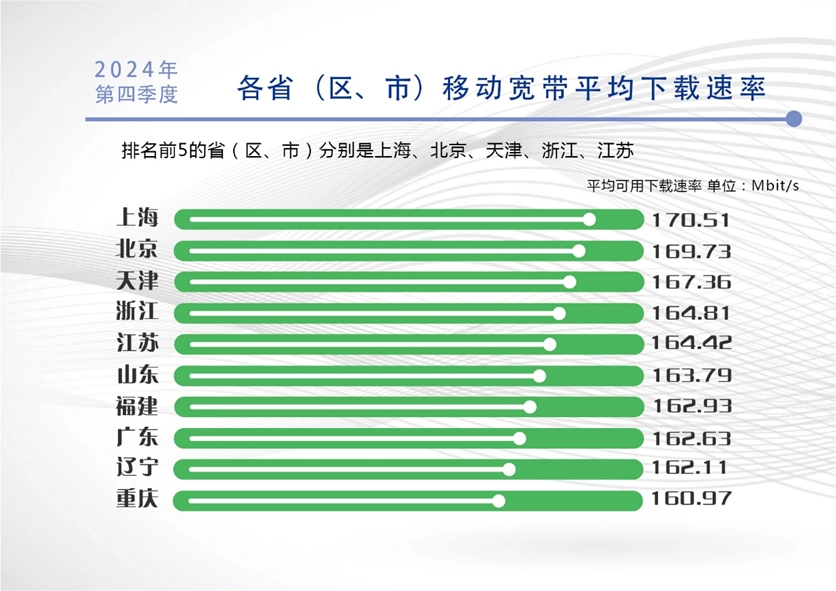 移动宽带下载速率方面,上海、北京、天津、浙江、江苏的移动宽带网络用户下载速率排在全国省级行政区前五位;各基础电信企业中,中国移动最高,全国用户平均移动宽带网络用户下载速率达到 160.38Mbit/s。