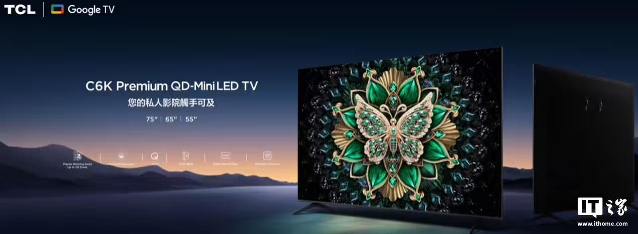 IT之家 6 月 10 日消息,TCL 发布 C6K Premium QD-Mini LED 智能电视,提供 55/65/75 英寸三种尺寸选择,采用 4K 144Hz HVA 面板。