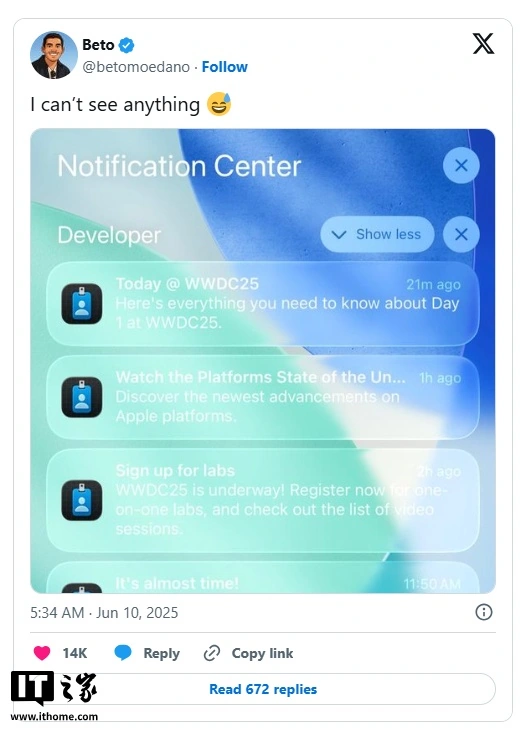 IT之家 6 月 11 日消息,苹果公司于今年的全球开发者大会(WWDC)上宣布了其全新的用户界面“液态玻璃”(Liquid Glass),并称其为“有史以来最全面的设计更新”,旨在统一苹果设备的使用体验。然而,尽管目前苹果仅发布了首个开发者测试版,许多用户和设计师已经对该设计提出了诸多批评,认为其存在诸多问题,例如可读性差、界面设计不完善等。“液态玻璃”设计显然会继续改进,但这些批评也有其合理性。