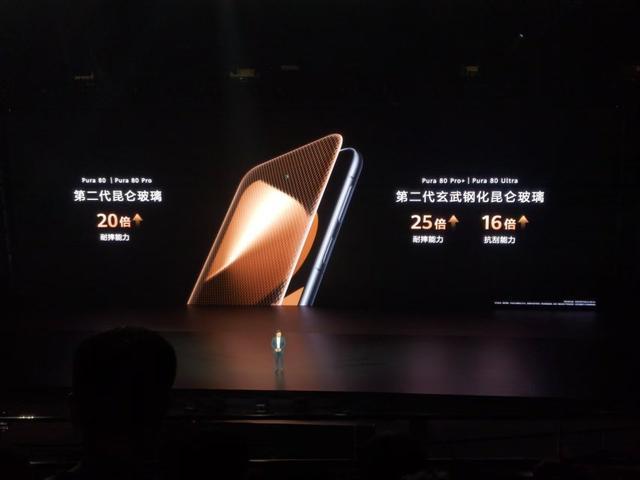 防护方面,华为 Pura 80 和 Pura 80 Pro 的屏幕采用了第二代昆仑玻璃,耐摔能力提升 20 倍;Pura 80 Pro+ 和 Pura 80 Ultra 采用了第二代玄武钢化昆仑玻璃,耐摔能力提升 25 倍,抗刮能力提升 16 倍。