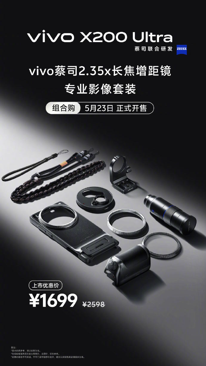 vivo 蔡司 2.35x 长焦增距镜与专业影像套装组合购 5 月 23 日开售,原价 2598 元,上市优惠价 1699 元。