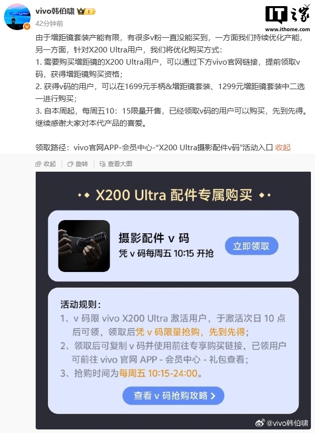 IT之家 6 月 12 日消息,vivo 产品经理韩伯啸今日发文称,由于增距镜套装产能有限,一方面将持续优化产能,另一方面,针对 X200 Ultra 用户将优化购买方式: