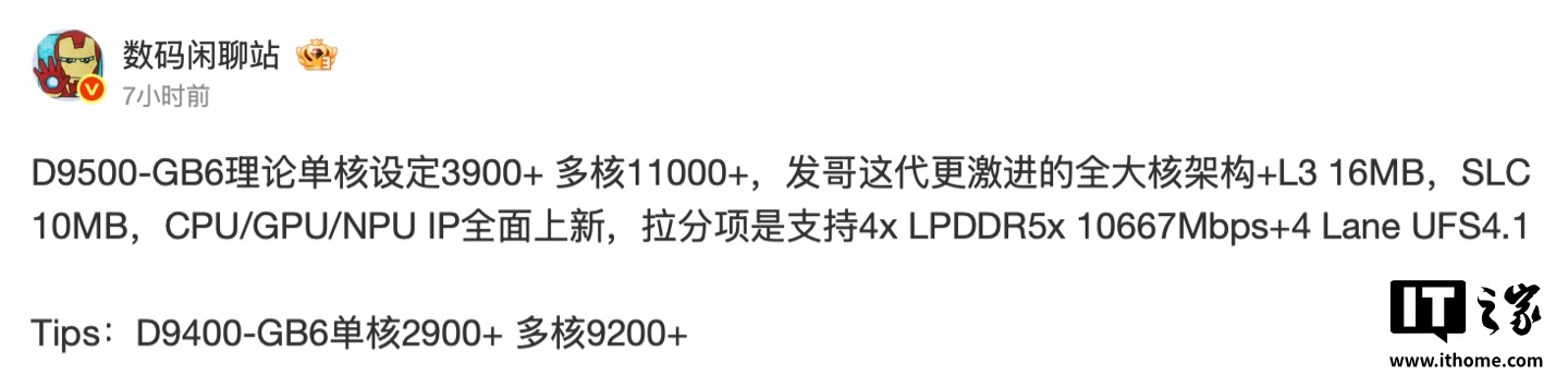 博主 @数码闲聊站 今日透露,天玑 9500 将采用更激进的全大核架构,搭配 16MB L3 缓存和 10MB SLC 缓存,CPU / GPU / NPU IP 全面上新,其 Geekbench 6 单核理论设定超过 3900 分,多核超 11000 分,拉分项是支持 4x LPDDR5x 10667Mbps+4 Lane UFS 4.1。