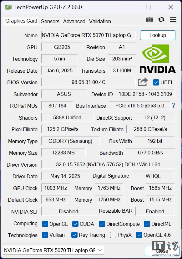 GPU 方面,我们收到的魔霸 9 搭载 NVIDIA GeForce RTX 5070 Ti Laptop GPU,其基于 NVIDIA Blackwell 架构打造。在流处理器方面,其配备了 5888 个 CUDA 核心,为图形处理提供强大的并行计算能力。显存规格颇为亮眼,采用 12GB GDDR7 显存,显存位宽为 192bit,带来高达 672GB/s 的显存带宽,能快速传输大量图形数据,满足高分辨率、高画质游戏对显存的苛刻需求。配合第五代 Tensor Core 与第四代 RT Core,不仅在传统图形渲染上表现出色,在 AI 加速与光线追踪领域也具备卓越性能,且支持 PCIe 5.0,数据传输速率大幅提升。此外,它的 AI 总算力达到 992 TOPS ,为游戏中 DLSS 4 技术、本地 AI 助手等提供坚实的运算基础。