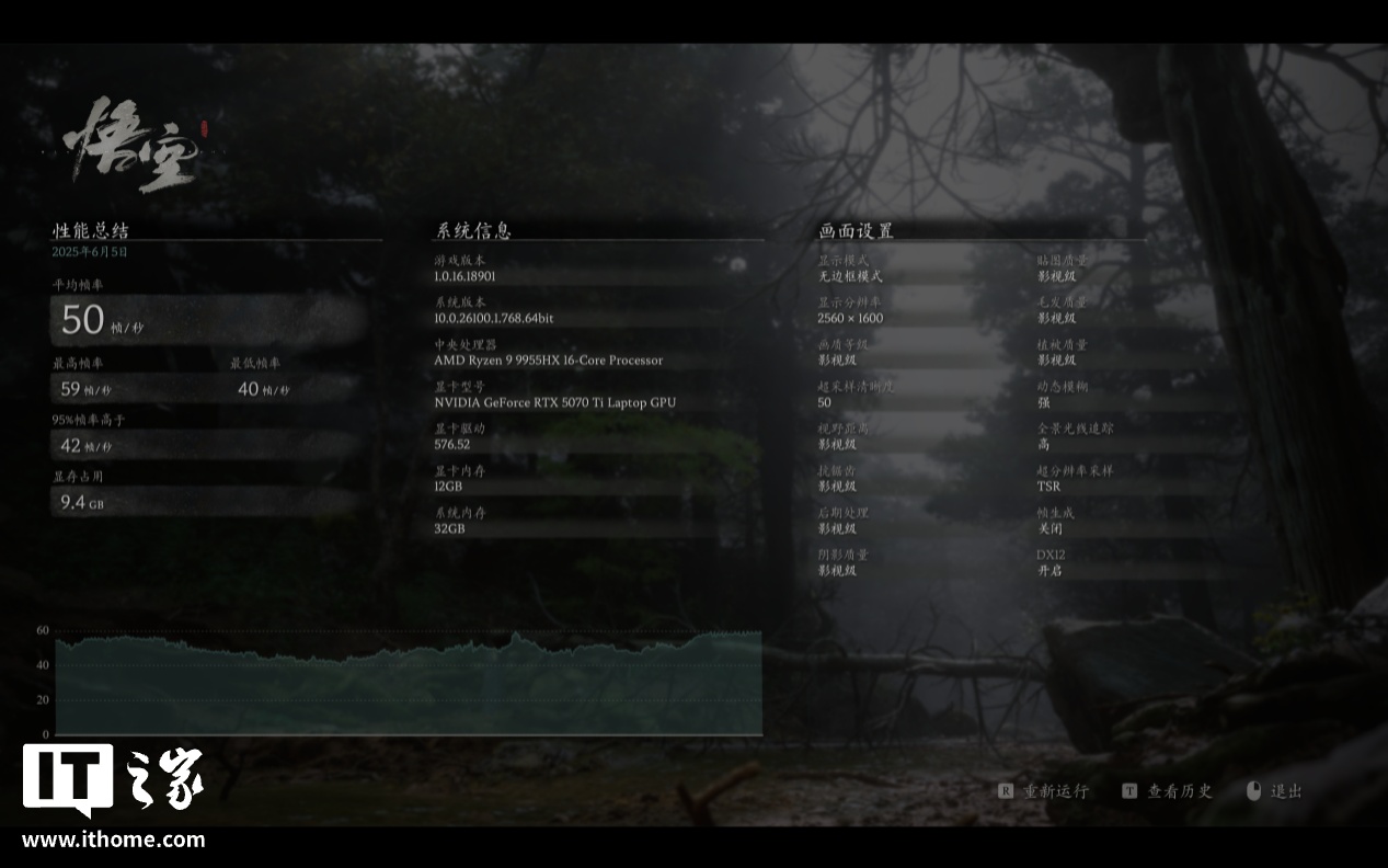 最为国产首个 3A 大作,《黑神话:悟空》一致有着较高的热度,去年还一度催生出了机潮。有不少爱好者为玩这款游戏攒主机买游戏本,我们这次也直接将画质拉到影视级,并开启全景光追,在 2.5K 原生分辨率下其平均帧率可达 50FPS。