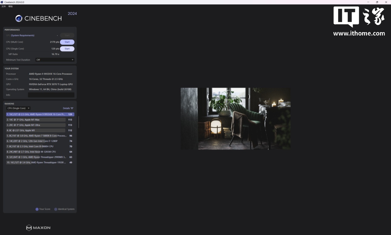 在 CineBench 2024 中,获得了单线程 129 分,多线程 2179 分的成绩,能在笔记本上体验到桌面端旗舰处理器的性能,这个表现还是很让人惊讶的。