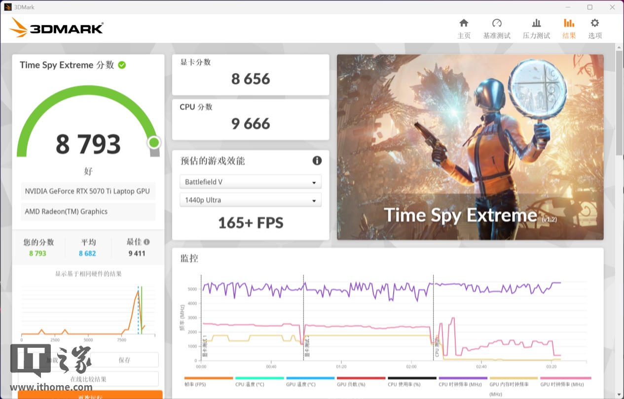 接下来看看 GPU 的表现,魔霸 9 的 RTX 5070 Ti Laptop GPU 在 3DMark Time Spy 中的 GPU 跑分达到了 18356 分,Time Spy Extreme GPU 分数 8656,而在光追测试 3DMark PortRoyal 中达到了 11793 分。