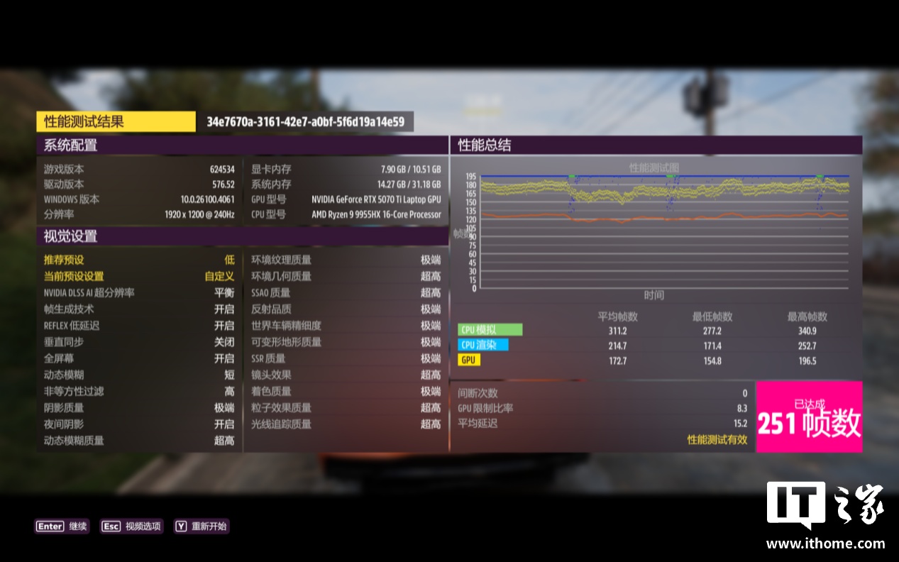 接下来是另一款 3A 游戏《地平线 5》,在 1200P 分辨率 + 极端画质的设置下平均帧率为 251FPS。