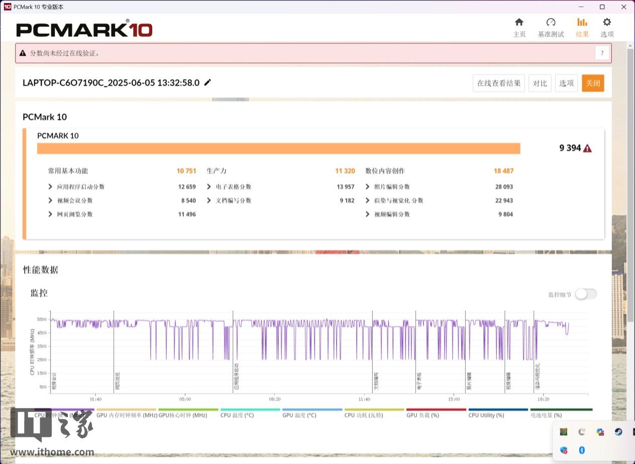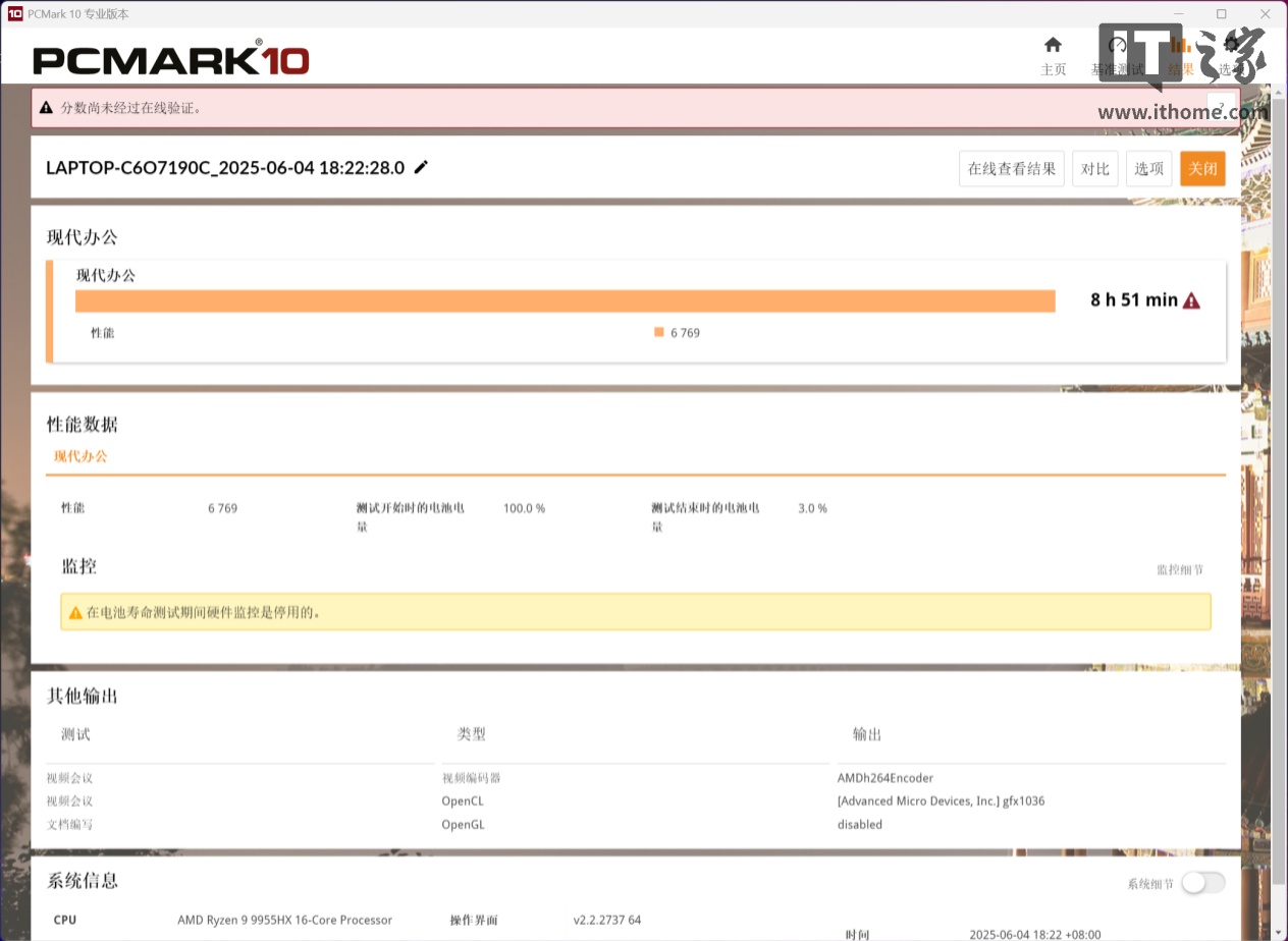ROG 魔霸 9 内置 90Wh 电池,若是轻度办公依旧可以有不错的续航成绩,我们将魔霸 9 更改为能效优先 + 集显输出 + 50% 屏幕亮度 + 飞行模式,使用 PCMark 10 现代办公测试续航,最终成绩为 8 小时 51 分钟。