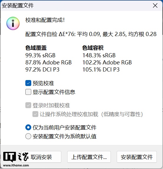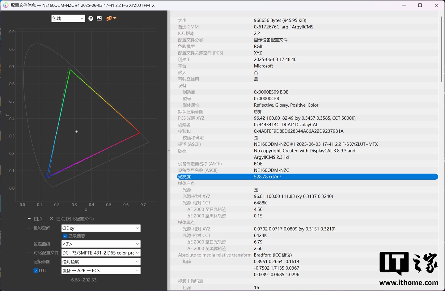魔霸 9 支持多种色域显示模式,可在奥创中心中快速切换。IT之家选择了原生与 DCI-P3 两种模式进行了测试,均覆盖约 97% 的 DCI-P3 色域,但 DCI-P3 的屏幕亮度要更高,可达 581.56nit。