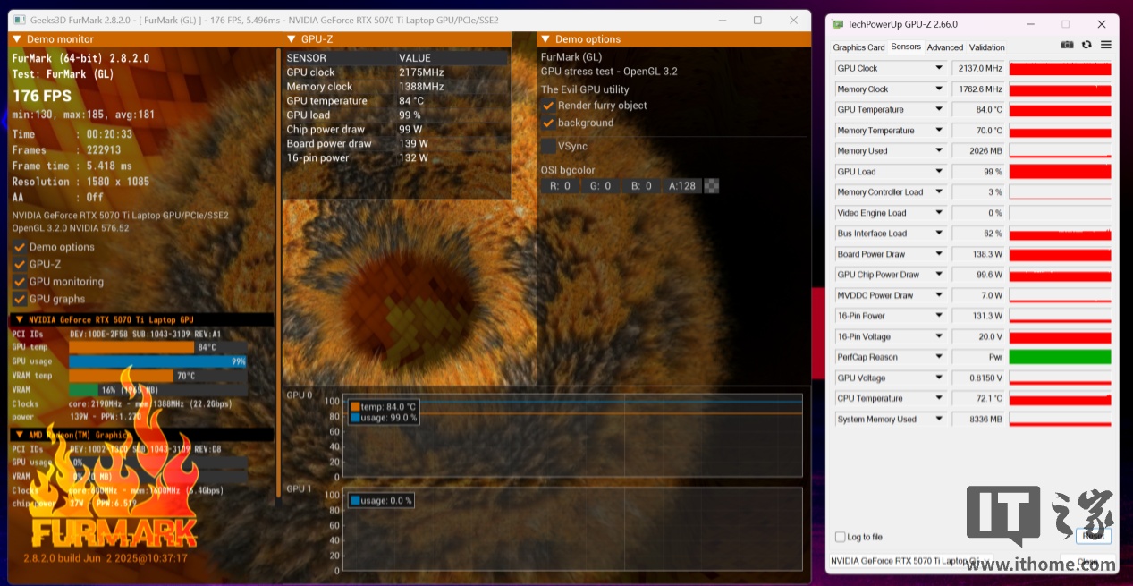 随后是 20 分钟的 GPU 单烤,其功耗基本全程稳定在 139W 左右,GPU 核心温度 84℃ 左右,显存温度 70℃ 左右。此时 GPU 频率维持在 2137MHz,性能释放相当充分。