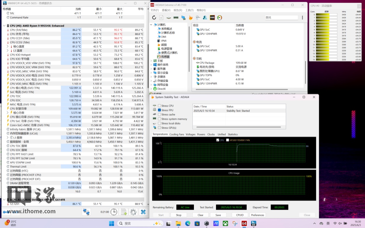 内藏 9955HX 和 RTX 5070 Ti Laptop GPU 两颗性能怪兽的魔霸 9 性能释放如何呢?我们接上电源、将笔记本性能模式更改为增强,并切换至独显直连进行烤机。首先是 20 分钟的 FPU 单烤测试,魔霸 9 先是火力全开,CPU 功耗飚至 129W,温度也达到了 95.5℃ ,8 分钟魔霸 9 将功耗稳定在 110W 左右,此时 CPU 核心温度为 86℃ 左右,核心主频 3.4GHz。