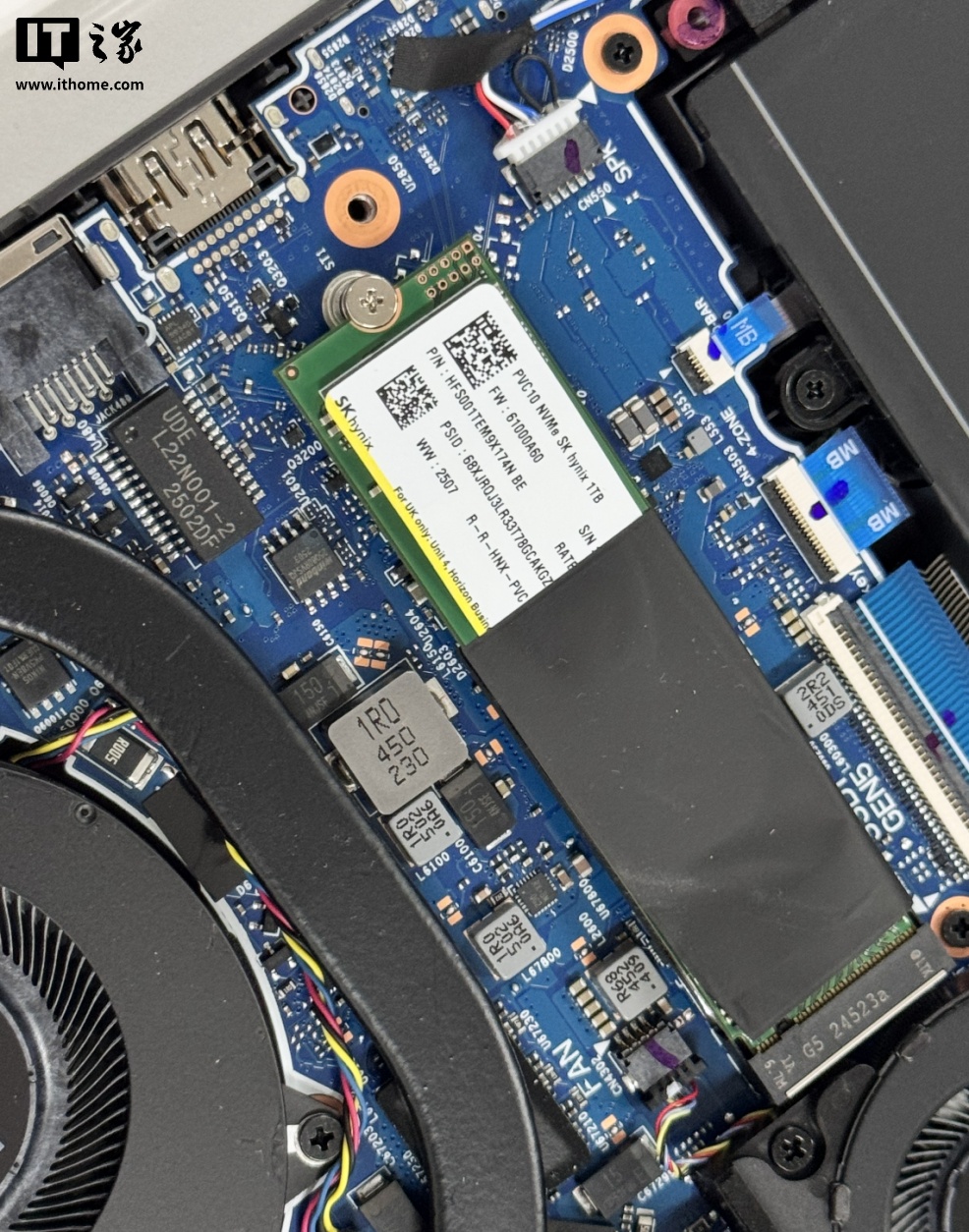 拓展性方面,魔霸 9 共有两个 M.2 插槽以及两个内存插槽。右侧 M.2 支持 PCIe 5.0,默认搭载海力士的 PVC10 1TB 固态。