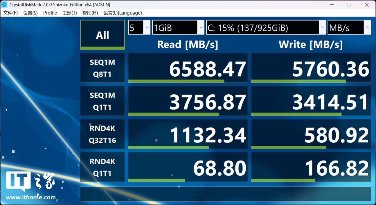 自带的硬盘是一块 Pcie 4.0*4 高速硬盘。IT之家实测顺序读取可达 6588.47MB/s,顺序写入可达 5760.36M/s。若是想要更出色的读写性能也可以自行加装升级 PCIe 5.0 的固态硬盘。