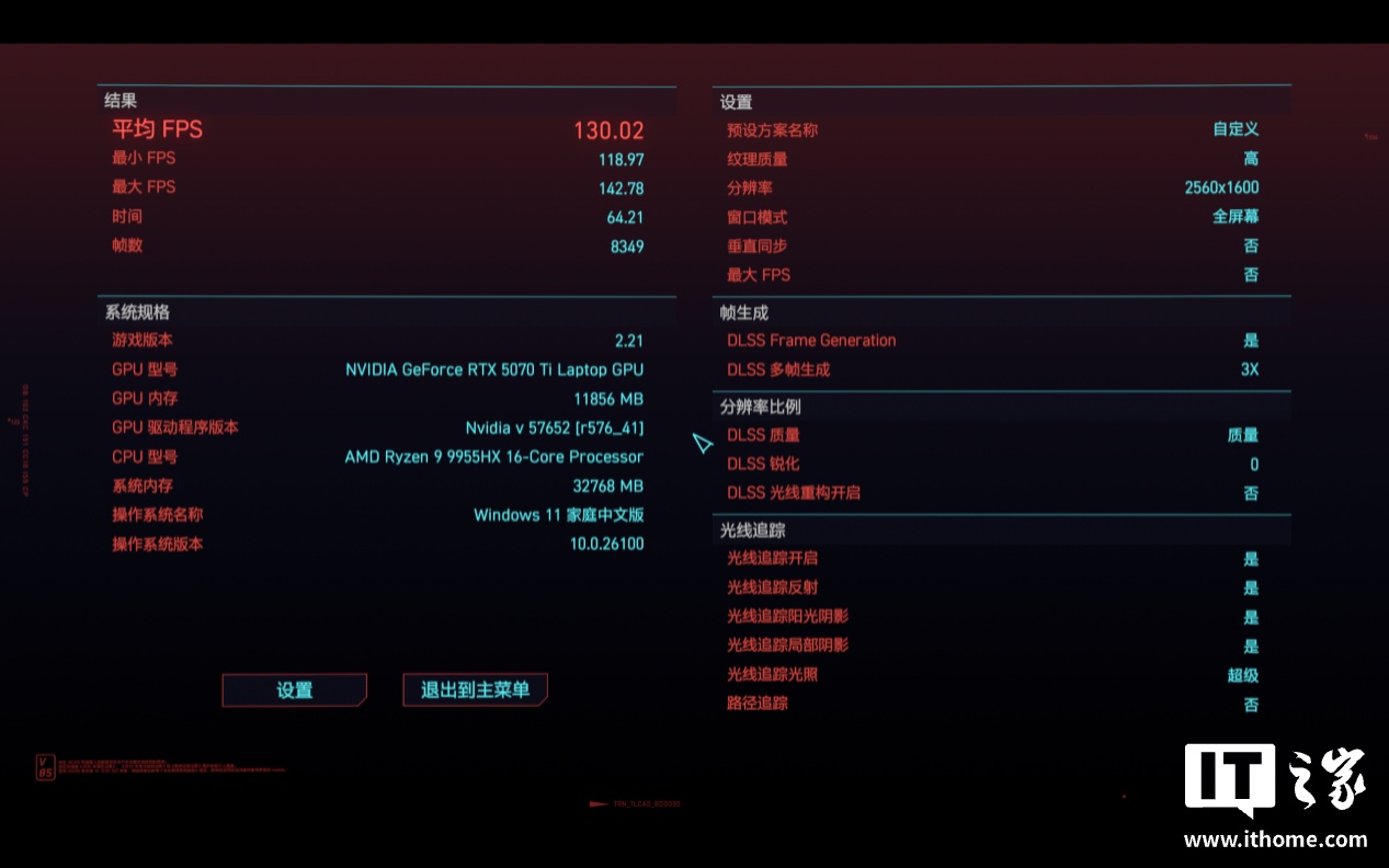 《赛博朋克 2077》我们先不开启光追,在 2.5K 原生分辨率下的超级画质进行测试,获得 75.73FPS 的成绩,显然已经很流畅了,但是对于一台搭载 5070 Ti Laptop GPU 的笔记本,我们理应有更高的追求。