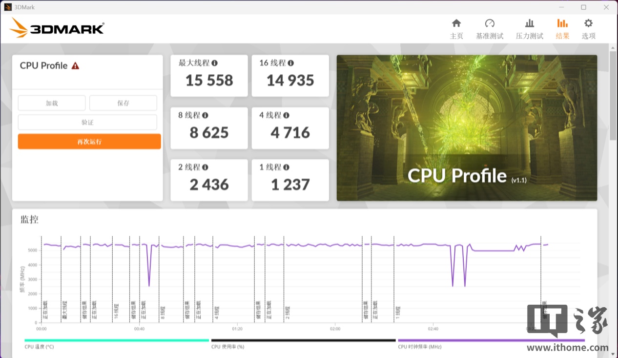随后是 3DMark CPU Profile,其单线程得分 1237 分,最大线程得分 15558 分,这意味着魔霸 9 可以轻松胜任重度的多任务处理。