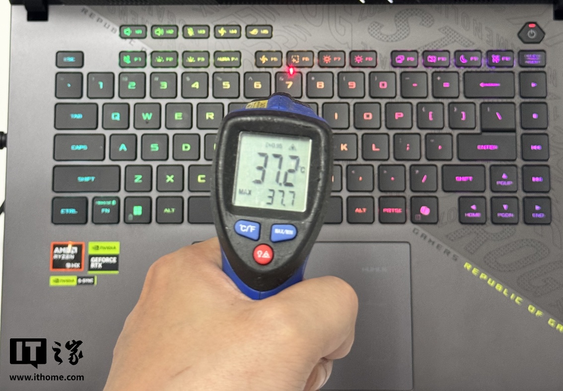单烤 GPU 后魔霸 9 C 面最高温度大概在 37.7℃左右,要比单烤 CPU 高一些。