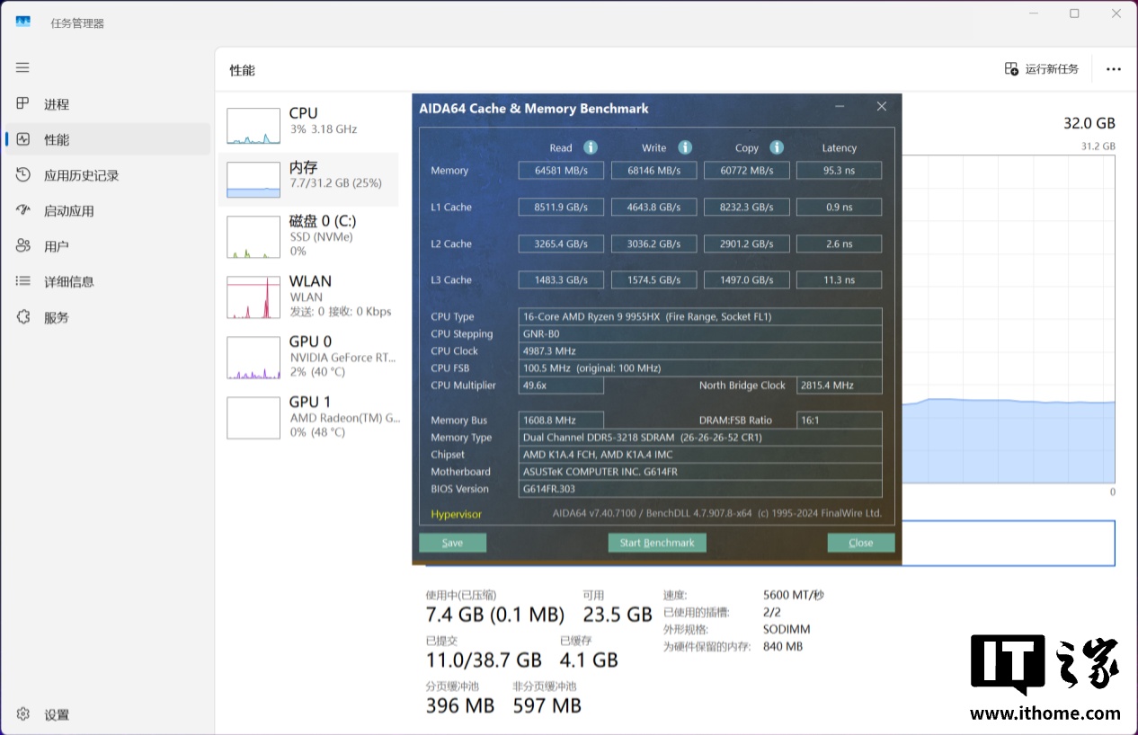 IT之家收到的 ROG 魔霸 9 搭载 AMD Ryzen 9 9955HX 处理器,其采用 4nm 制程工艺,拥有 16 核心 32 线程。其基础频率为 2.5GHz,加速频率最高可达 5.4GHz,无论是多任务处理还是对单核性能要求极高的游戏场景,都能轻松应对。在缓存方面,该处理器配备了 16MB 二级缓存、64MB 三级缓存,在游戏加载或是重度生产力软件中都颇具优势。