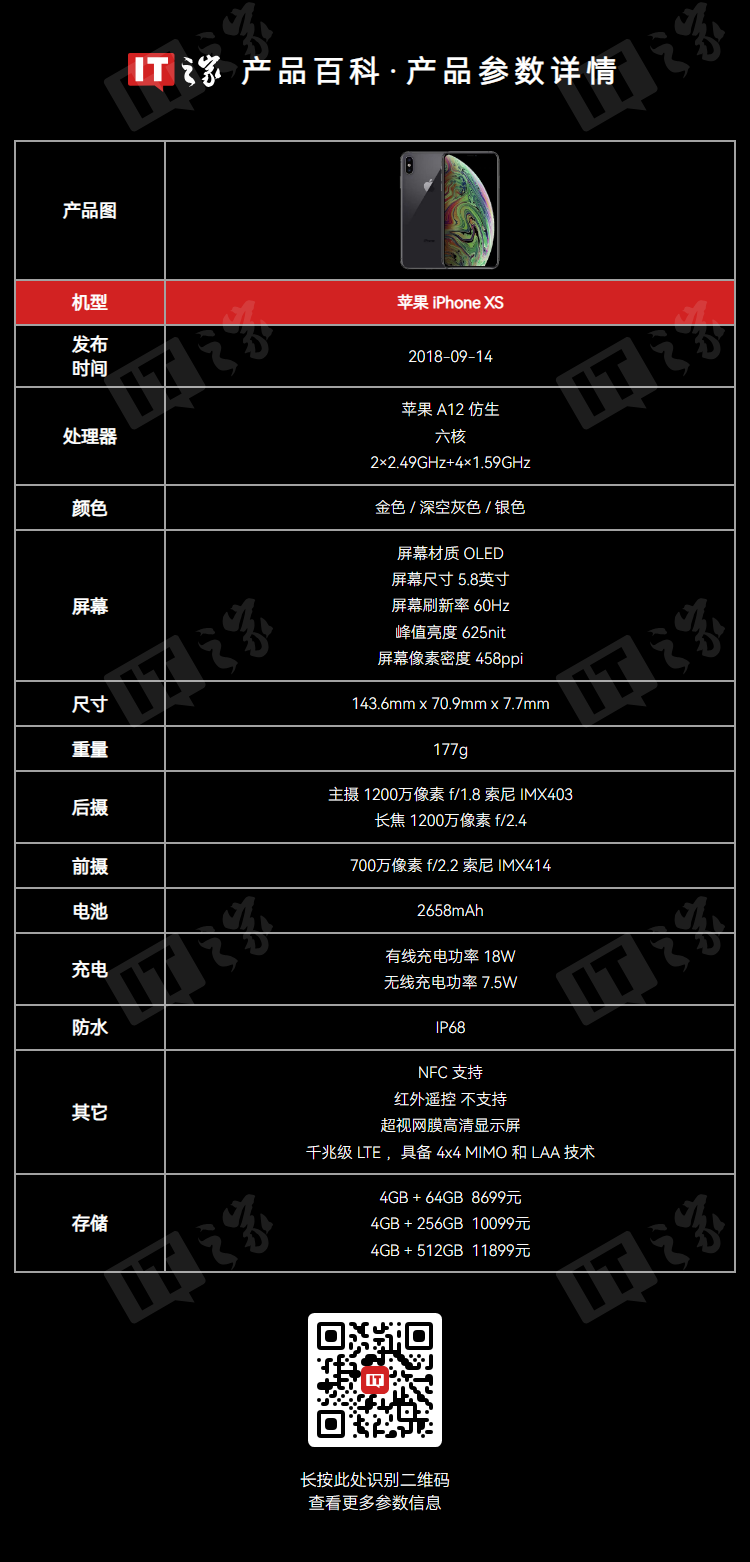 苹果 iPhone XS 手机发布于 2018 年 9 月 12 日,该机延续了 iPhone X 的“刘海”全面屏设计,搭载 5.8 英寸超视网膜显示屏,配有 A12 仿生芯片,相比上一代 A11 仿生芯片性能提升 15%,功耗更低;出厂搭载 iOS 12 系统,可选 64/256/512GB 容量,售价 8699 元起。