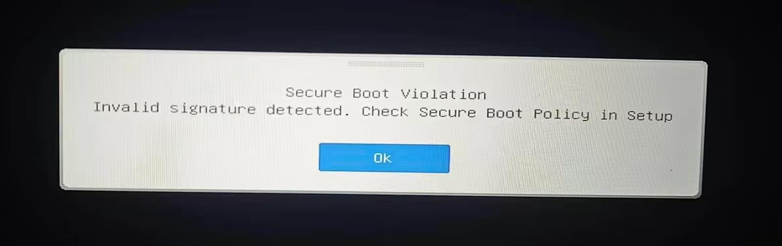 Surface Hub v1 运行 Windows 10 Version 22H2 系统,在安装 6 月累积更新之后,开机后可能显示“Secure Boot 非法。检测到无效签名,请在设置中检查安全启动策略。”的错误提示。