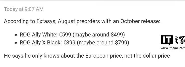 在售价方面,消息源在欧洲市场,称白色版 ROG Xbox Ally 定价为 599 欧元(IT之家注:现汇率约合 4967 元人民币),而黑色版(性能更强)的 ROG Xbox Ally X,定价高达 899 欧元(现汇率约合 7455 元人民币)。