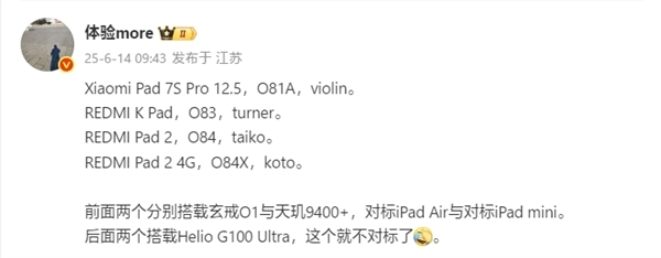 值得注意的是,日前卢伟冰还曾隐晦的爆料过这款新品,称接下来的两款平板新品分别对标iPad Air、iPad mini。