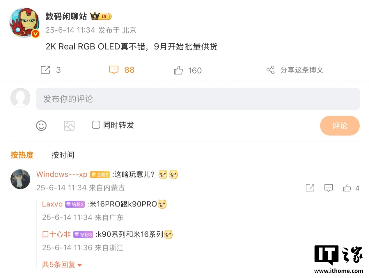 文章来源于互联网:IT之家-消息称 2K Real RGB OLED 面板 9 月开始批量供货,有望应用于小米 16 / K90 系列手机