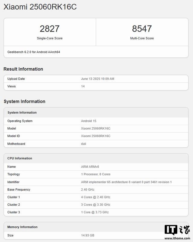 IT之家 6 月 15 日消息,一款型号为 25060RK16C 的小米新机近日现身跑分平台 Geekbench,预计为 REDMI K80 至尊版。
