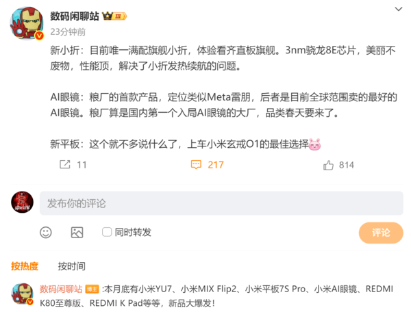 该博主称,本月底有小米YU7、小米MIX Flip2、小米平板7S Pro、小米AI眼镜、REDMI K80至尊版、REDMI K Pad等等,新品大爆发!该博主称,小米MIX Flip2目前唯一满配旗舰小折叠,体验看齐直板旗舰。搭载3nm骁龙8至尊版移动平台,性能非常顶,并且解决了小折发热续航的问题。