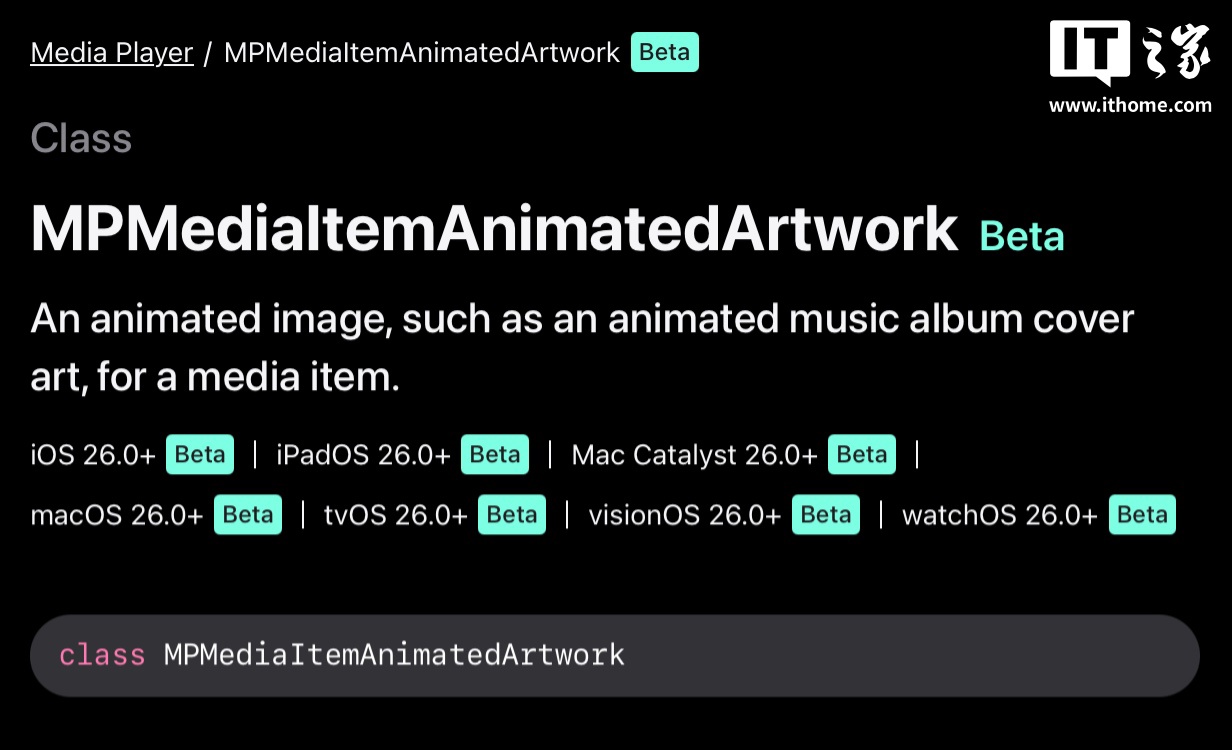 苹果官方开发者文档显示,媒体动态插画显示功能的类名为 MPMediaItemAnimatedArtwork,其运作需动态视频素材,以及与首帧匹配的预览图像,在获取视频素材时,系统会先用预览图像作为占位图。