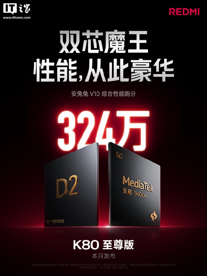 根据官方此前公布的信息,REDMI K80 至尊版搭载天玑 9400 + 旗舰芯,并首发独显芯片 D2,安兔兔跑分突破 324 万,创造了同平台新纪录。同时,K80 至尊版配备了狂暴引擎 4.0,这是行业内更深度的性能调优技术。