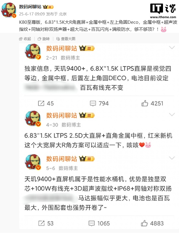 IT之家 6 月 17 日消息,小米 REDMI K80 至尊版手机将于本月发布,博主 @数码闲聊站 今日曝光了新机的部分规格。