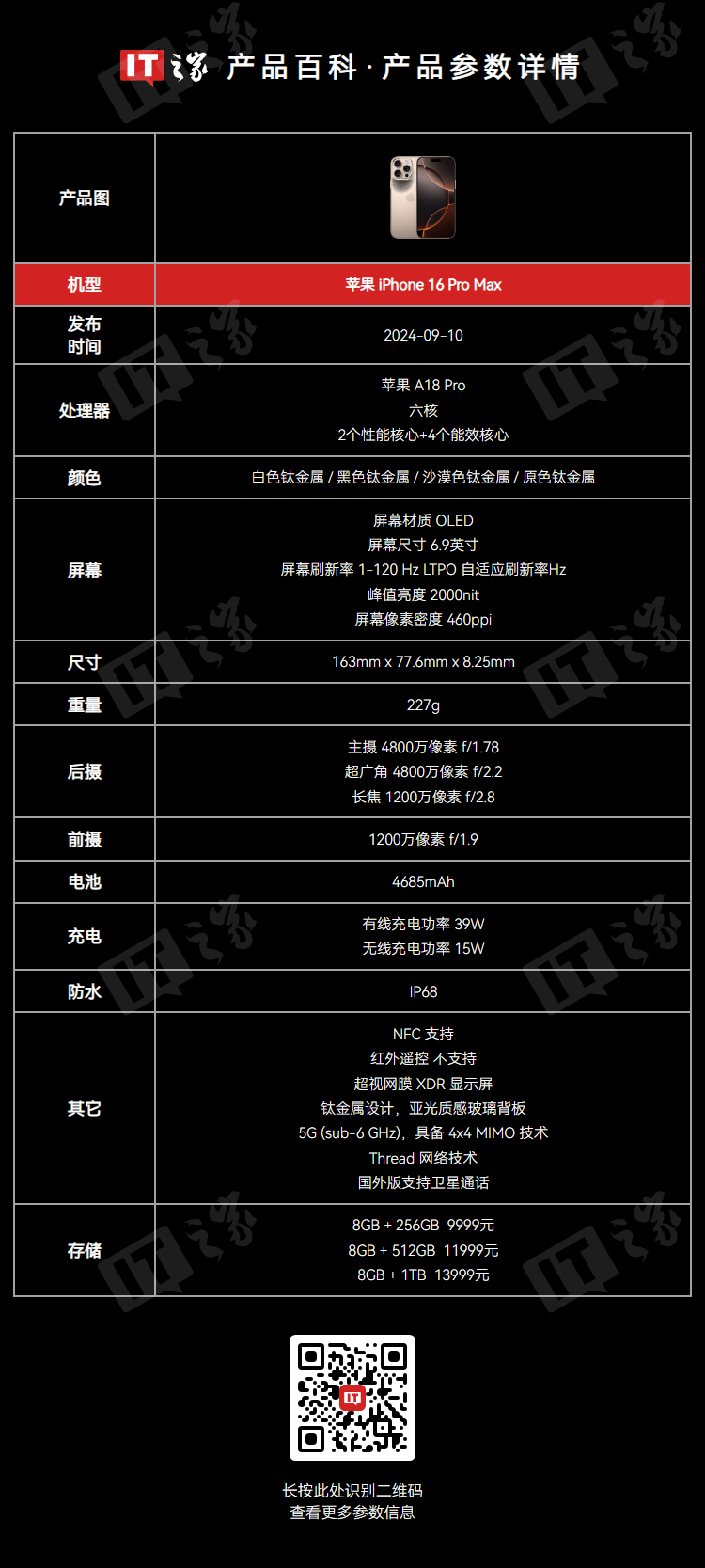 iPhone 16 Pro Max 手机 512G 版发售价为 11999 元。