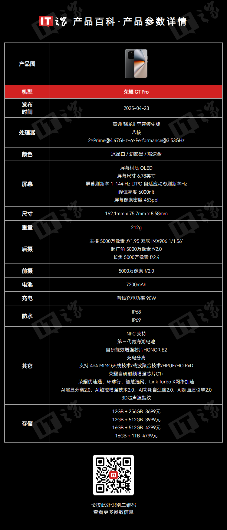 荣耀 GT Pro 手机发布于 4 月 23 日,16GB+512GB 官方定价 4299 元。