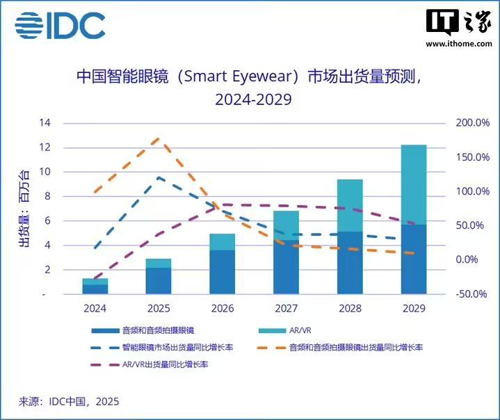 IT之家从报告中获悉,2025 年第一季度中国智能眼镜(Smart Eyewear)市场出货量 49.4 万台,同比增长 116.1%。其中中国音频和音频拍摄眼镜市场出货量 35.9 万台,同比增长 197.4%。中国音频和音频拍摄眼镜市场目前仍然以音频眼镜产品为主,主要玩家包括小米、华为、界环等;一季度雷鸟新品 V3 开售,带动音频拍摄眼镜市场增长显著。AR / VR 市场出货量 13.5 万台,同比增长 25.2%。主要玩家包括 Pico、Xreal、雷鸟、Inmo 等。