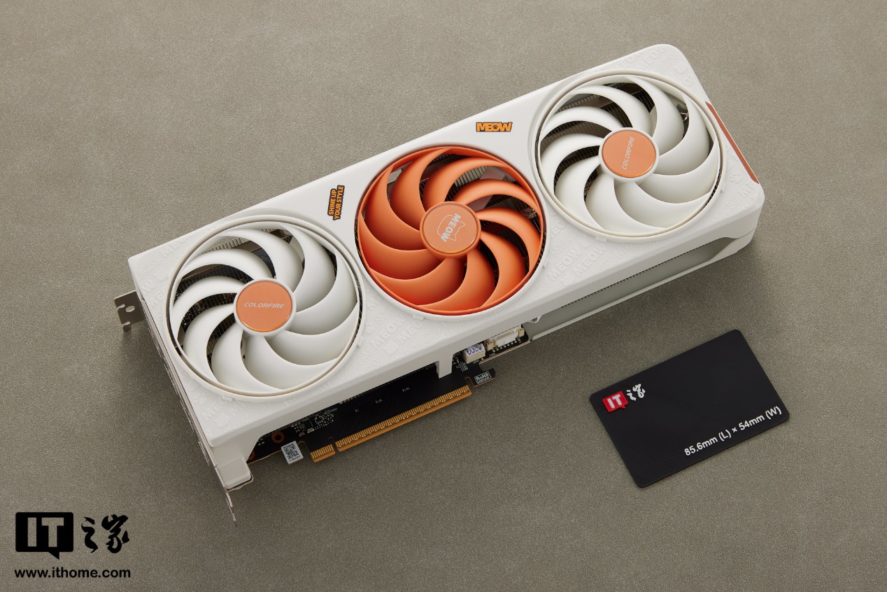 显卡正面装甲采用暖白色基调、辅以 MEOW LOGO 烫印晒纹和橘色贴纸风标签,强化了其外观上的潮流属性。三风扇部分则采用了 2 白加 1 橘的撞色风格,且风扇轴柱也都做了橘色点缀,中间风扇的轴柱上还印有猫头图案以及 MEOW Logo,持续输出“萌力”。